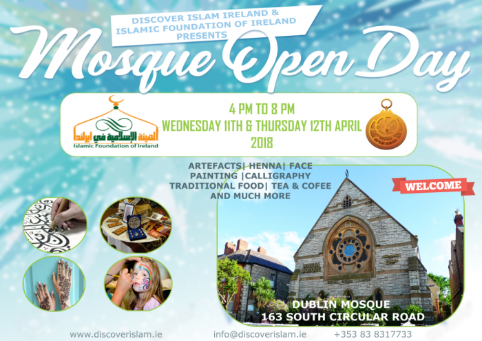 THE ISLAMIC FOUNDATION OF IRELAND AND DISCOVER ISLAM IRELAND ARE PLEASED TO PRESENT MOSQUE OPEN DAYS ON WED, 11TH APRIL AND THURSDAY 12TH APRIL 2017 FROM 4 - 8PM.